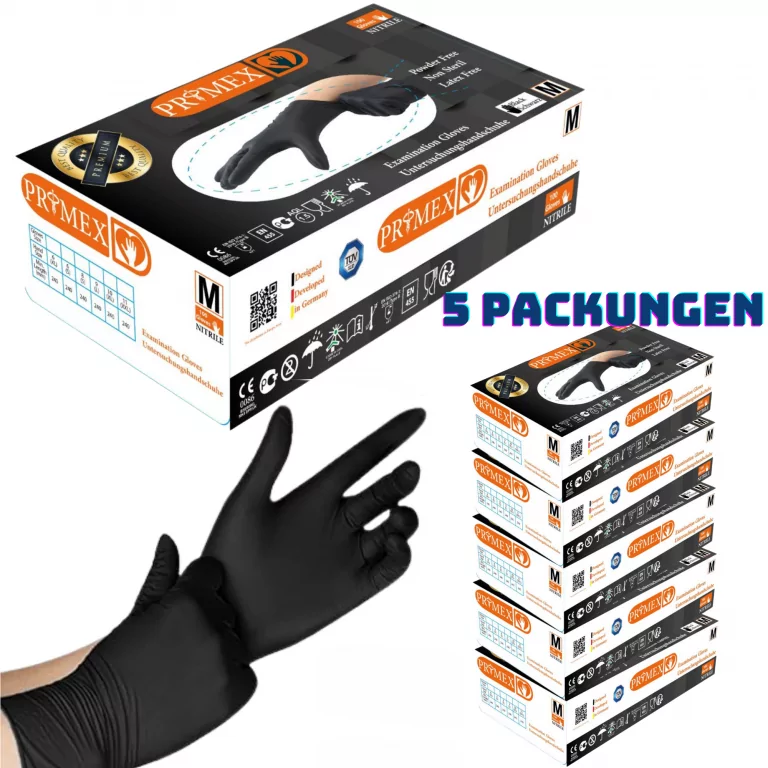 Primex Einweghandschuhe 500 Stück (5×100), Große M, Schwarze Einmalhandschuhe, puderfreie & latexfreie Nitrilhandschuhe, in Gr. S, M, L & XL