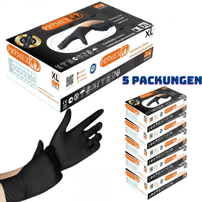 Primex Einweghandschuhe 500 Stück (5×100), Große XL, Schwarze Einmalhandschuhe, puderfreie & latexfreie Nitrilhandschuhe, in Gr. S, M, L & XL