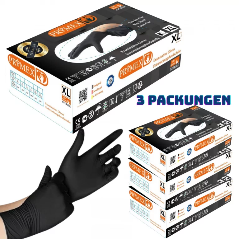 Primex Einweghandschuhe 300 Stück (3×100), Große XL, Schwarze Einmalhandschuhe, puderfreie & latexfreie Nitrilhandschuhe, in Gr. S, M, L & XL