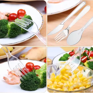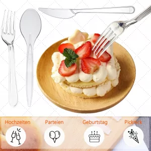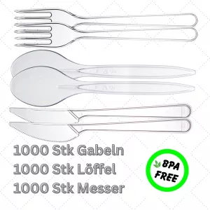 Mehrweg Plastikbesteck – 3.000 Stück/Karton (30×100) – Wiederverwendbar Plastikbesteck – Löfeln, Messer, Gabel – Deluxe, transparent