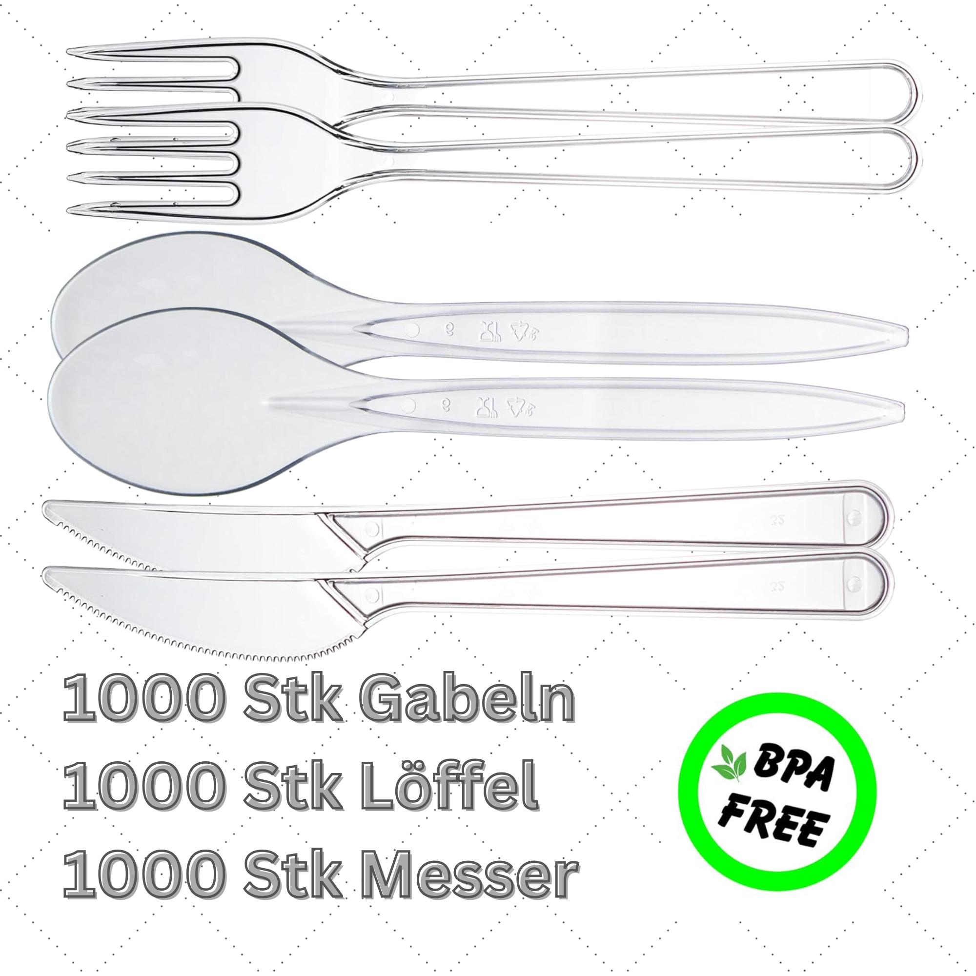 Mehrweg Plastikbesteck – 3.000 Stück/Karton (30×100) – Wiederverwendbar Plastikbesteck – Löfeln, Messer, Gabel – Deluxe, transparent