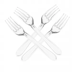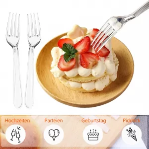 • Unsere hochwertigen, transparenten Plastikgabeln sind spülmaschinengeeignet und wiederverwendbar.