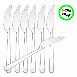 • Unsere hochwertigen, transparenten Plastikmesser sind spülmaschinengeeignet und wiederverwendbar.