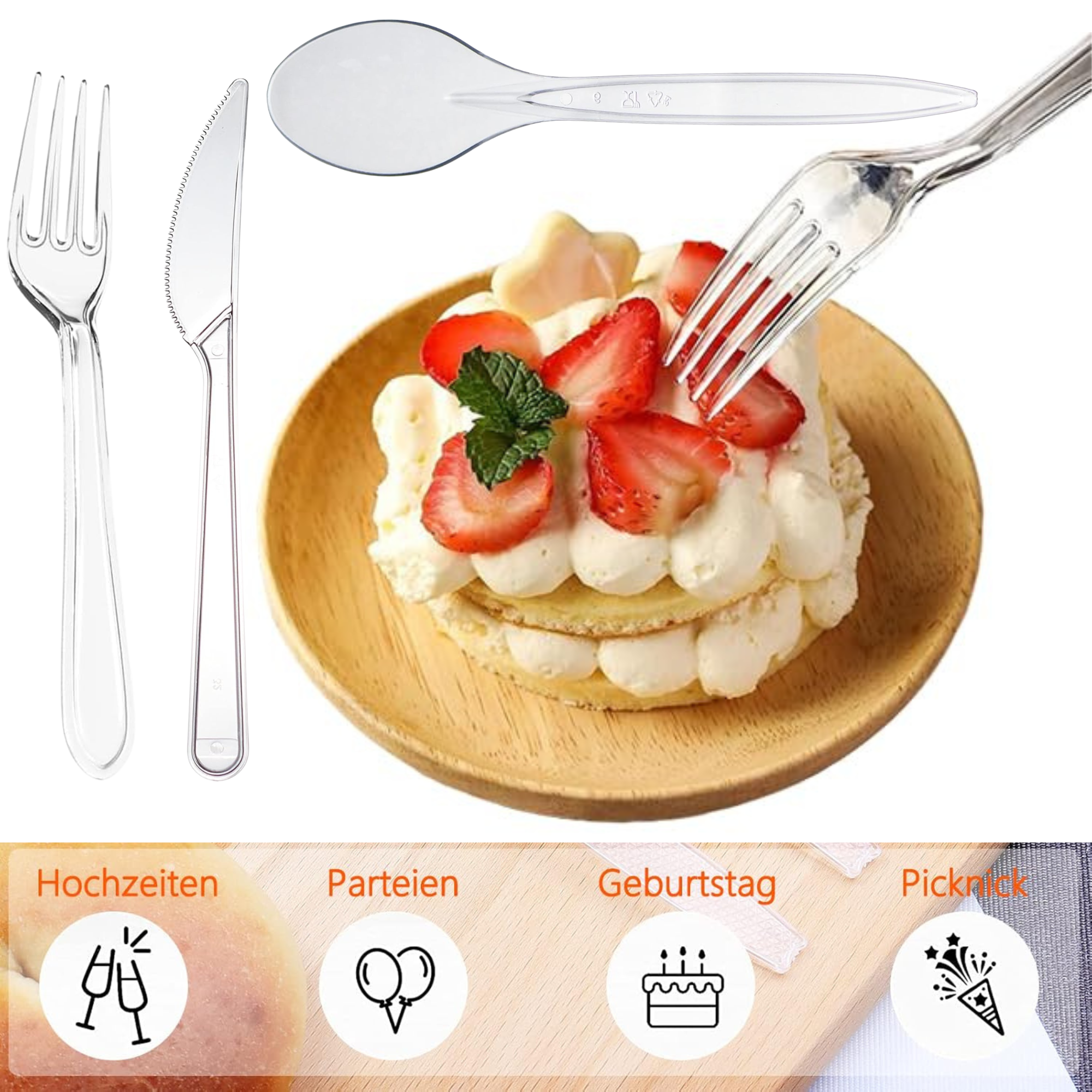 • Unsere hochwertigen, transparenten Plastikmesser sind spülmaschinengeeignet und wiederverwendbar.