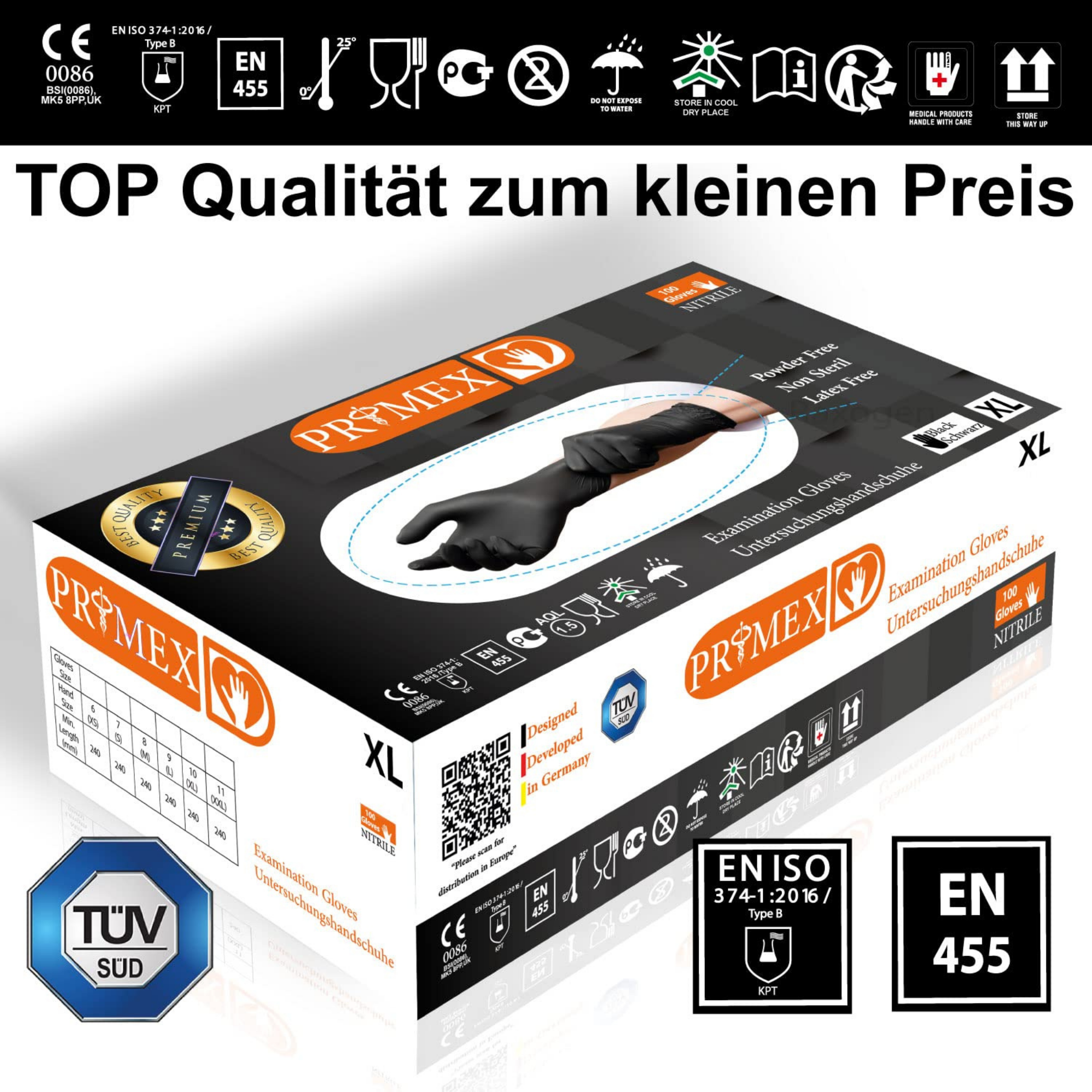 - ZUVERLÄSSIGER SCHUTZ: Die PRIMEX Nitril Einweghandschuhe in Schwarz erfüllen höchste Standards (TÜV-zertifiziert, EN 455, EN 374). Ideal für medizinische Zwecke, aber auch perfekt für den Alltag und den Haushalt!
